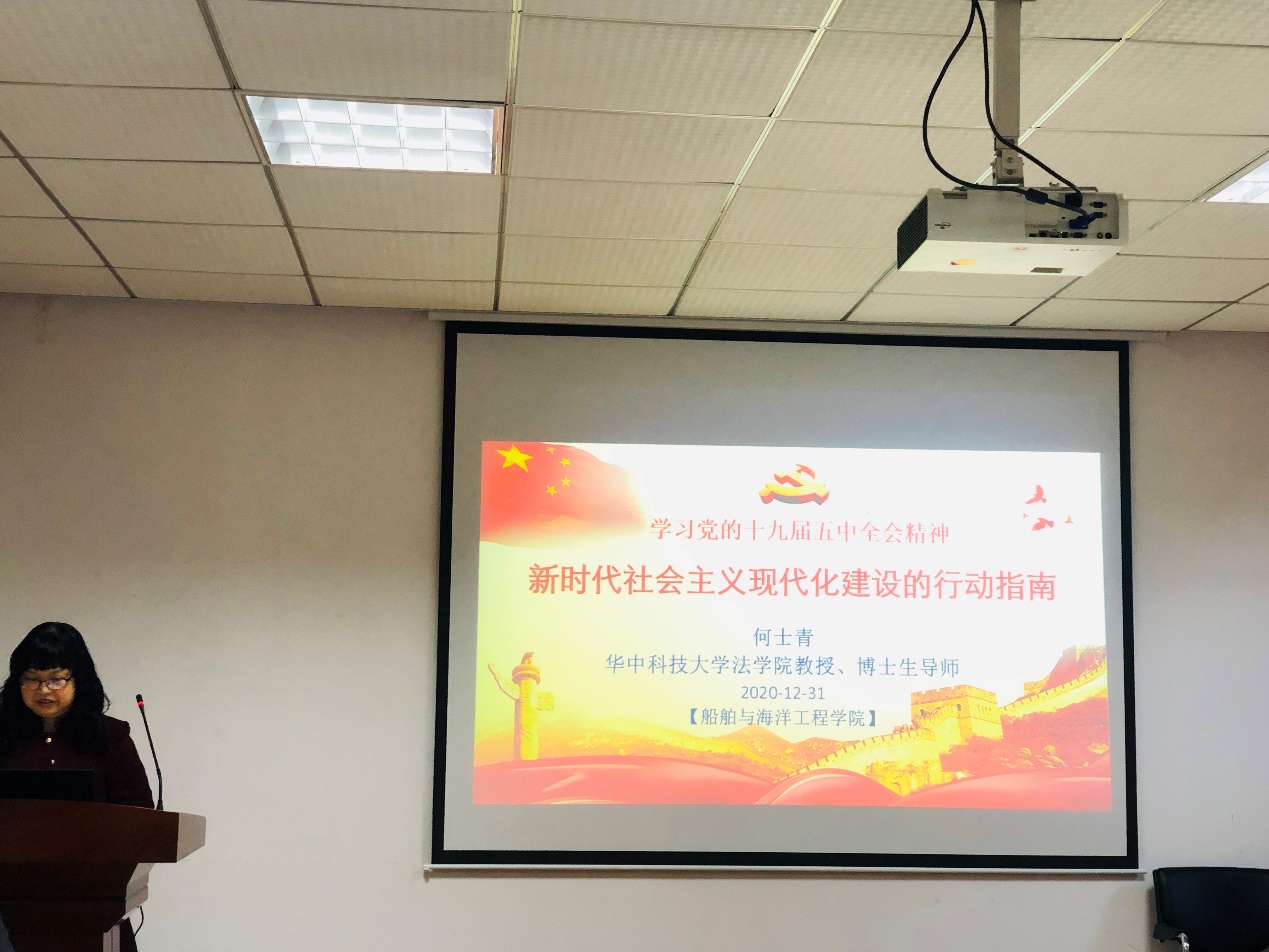 为加强党员伟德官网,深入贯彻学习党的十九届五中全会精神,船海学院于12月31日在东二楼会议室举办“新时代社会主义现代化建设的行动指南——党的十九届五中全会精神解读”讲座。本次讲座邀请法学院何士青教授担任主讲人,船海学院党委书记王作红主持会议,船海学院教职工党员代表,离退休教职工党员代表,学生党员代表参加会议。
