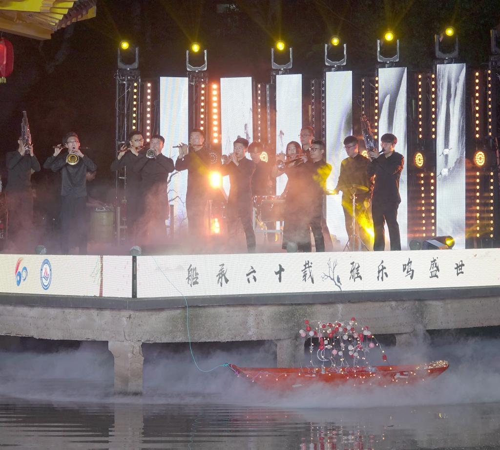 “神州大地花似锦,祖国长空曲如潮”。篇章四憧憬在承前启后、继往开来的新时代背景下,中华民族伟大复兴的光明前景。也是展示新中国成立七十周年来,中华儿女在开创绵亘万里的丝绸之路时披荆斩棘、一往无前的精神风貌。来自中国地质大学的独弦琴弹唱《风吹云飘》,展现了京族人民以海为伴、以海为家的海洋文化。武汉纺织大学民乐合奏《花好月圆》,灵活地将西方和声技法和具有浓郁民族风格的旋律相结合,表达了人们对美好生活的憧憬。我校笙协奏《欢乐的草原》是一首活泼的新疆曲,由辽阔的草原转向人们欢快的狂舞。武汉音乐学院吹打乐合奏《风入松》,气势恢宏,给晚会画上圆满的句号。