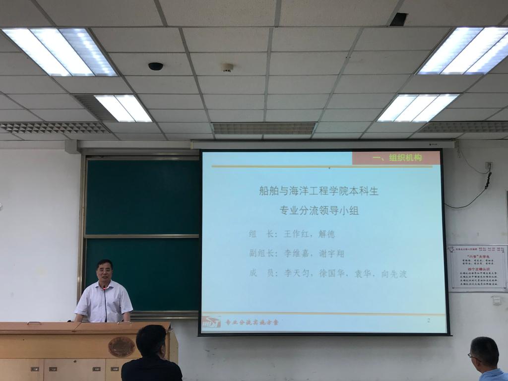 6月15日上午8:00,船海学院在东九教学楼C102教室举行2017级本科生专业分流宣讲会。会议由船海学院党委副书记谢宇翔主持,院党委书记王作红、副院长李维嘉教授、船舶与海洋工程系主任李天匀教授、朱翔副教授,轮机工程及自动化系党支部书记向先波副教授、教务员卢慧老师及17级辅导员李伟伟出席本次会议。