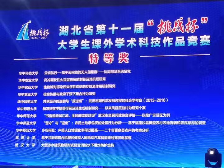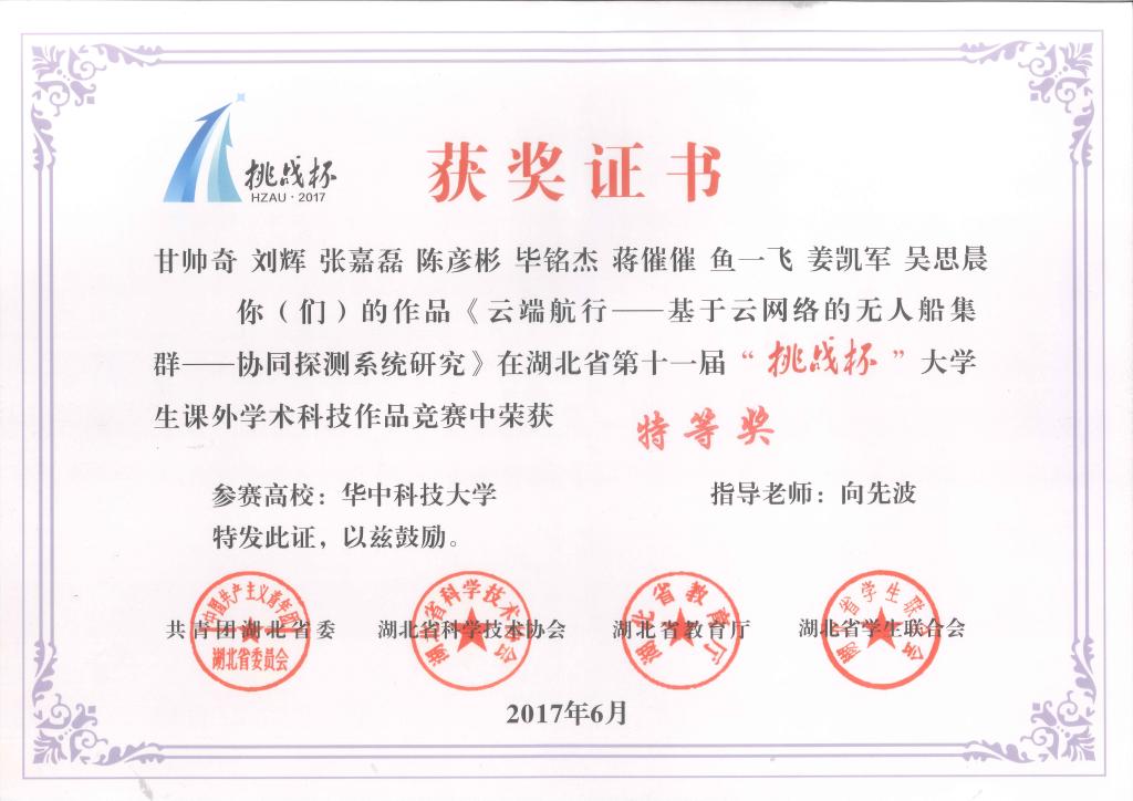 6月9日,由团省委、省科协、省教育厅、省学联联合主办的湖北省第十一届“挑战杯”大学生课外学术科技作品竞赛终审决赛暨闭幕式在华中农业大学举行。来自全省72所高校的693件作品参加本届竞赛,伟德国际1946向先波老师指导的学生团队作品“云端航行——基于云网络的无人船集群协同探测系统研究”,荣获本届“挑战杯”省赛的特等奖。