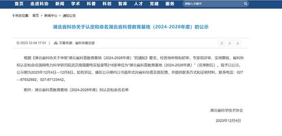 2023年12月4日,经伟德国际1946积极申报、湖北省科协评定,伟德国际1946成功获评“湖北省科普教育基地(2024-2028年度)”。