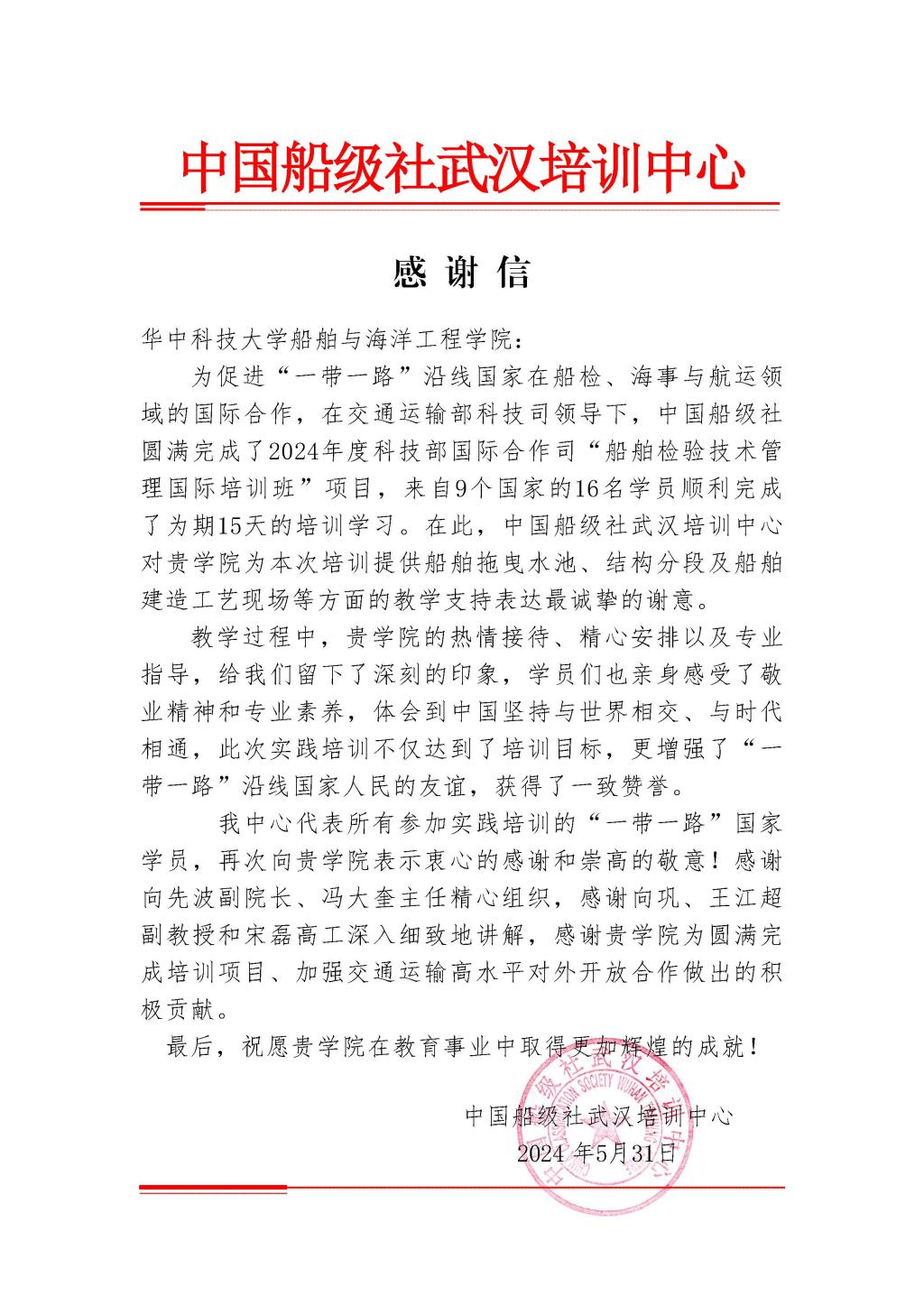 6月3日,伟德国际1946收到来自中国船级社武汉培训中心的感谢信。