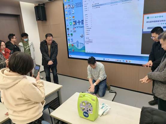 讲座第二部分聚焦“心肺复苏——做生命的守护者”。张鹏教授从视频案例切入,系统介绍了心脏骤停识别、心肺复苏流程、胸外按压位置与手法、人工呼吸操作要点。为强化实践技能,现场还设置了模拟人教具,供教师们进行胸外按压实操练习。不少教师表示:“这是第一次亲手实践心肺复苏,比想象中要更加吃力”。