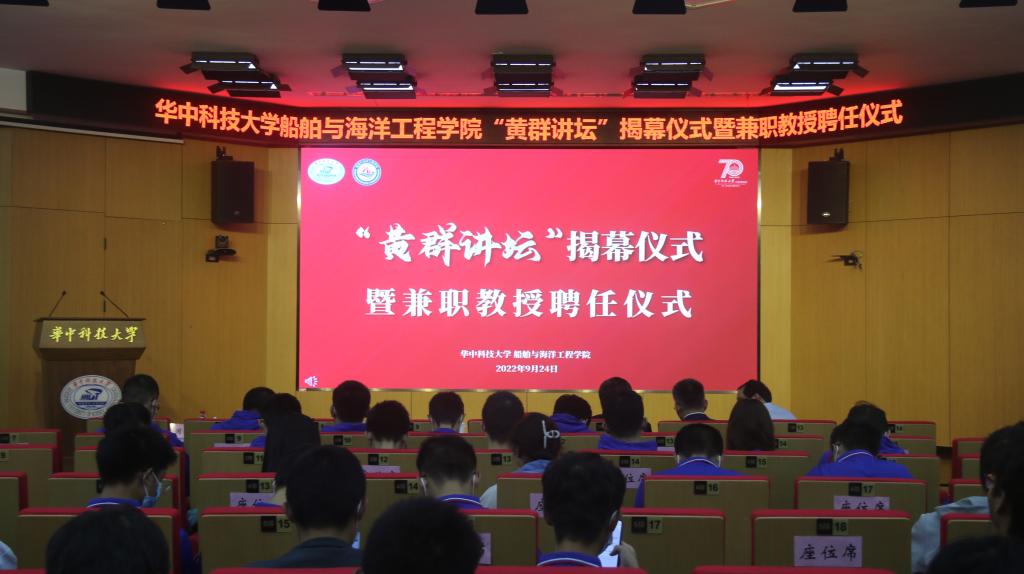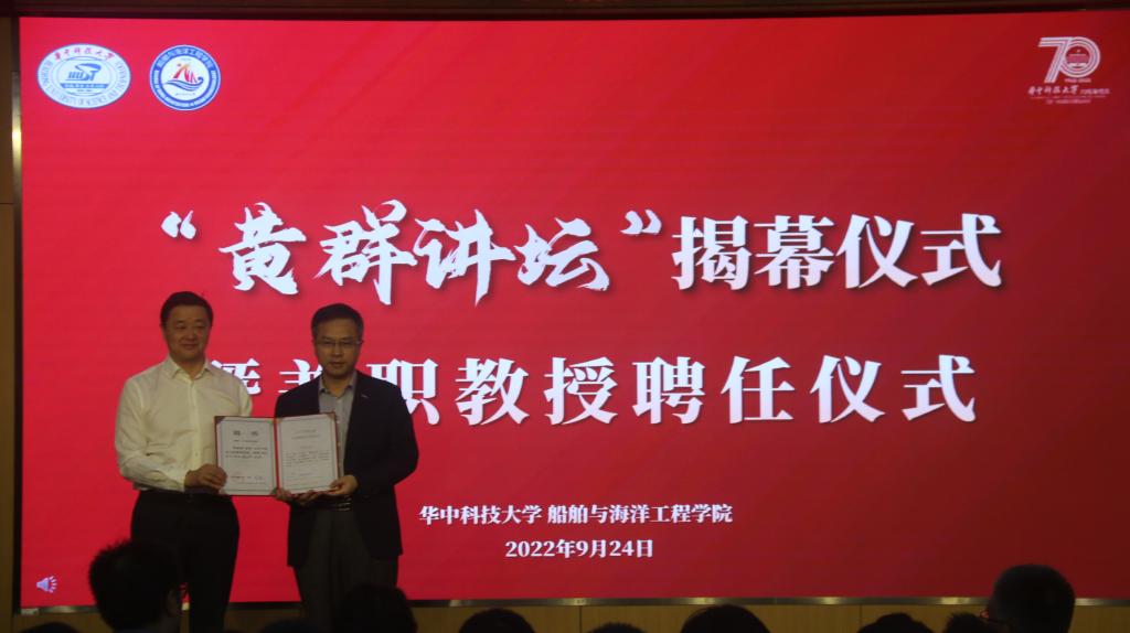 许晓东为中国舰船研究设计中心副所长谢伟颁发我校兼职教授聘书。许晓东表示,黄群同志是华科大培养的杰出校友。船海学院成立“黄群讲坛”,冠以英雄的姓名,这是迎接华科大七十周年校庆的重要贺礼,也是学院继承和发扬黄群精神的新起点。他向同学们提出三点希望:要进一步学习黄群精神,树立报国志向;要提升专业本领,勇攀科技高峰;要传承红色基因,绽放青春活力。