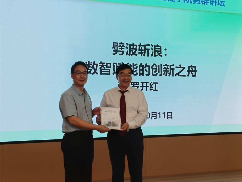 活动伊始,师生以热烈掌声迎接罗开红院士的到来。李威院长为罗院士颁发"黄群讲坛"嘉宾证书,罗开红师兄饱含深情,表达了对母校的深切眷恋和对学弟学妹们的殷切期望。