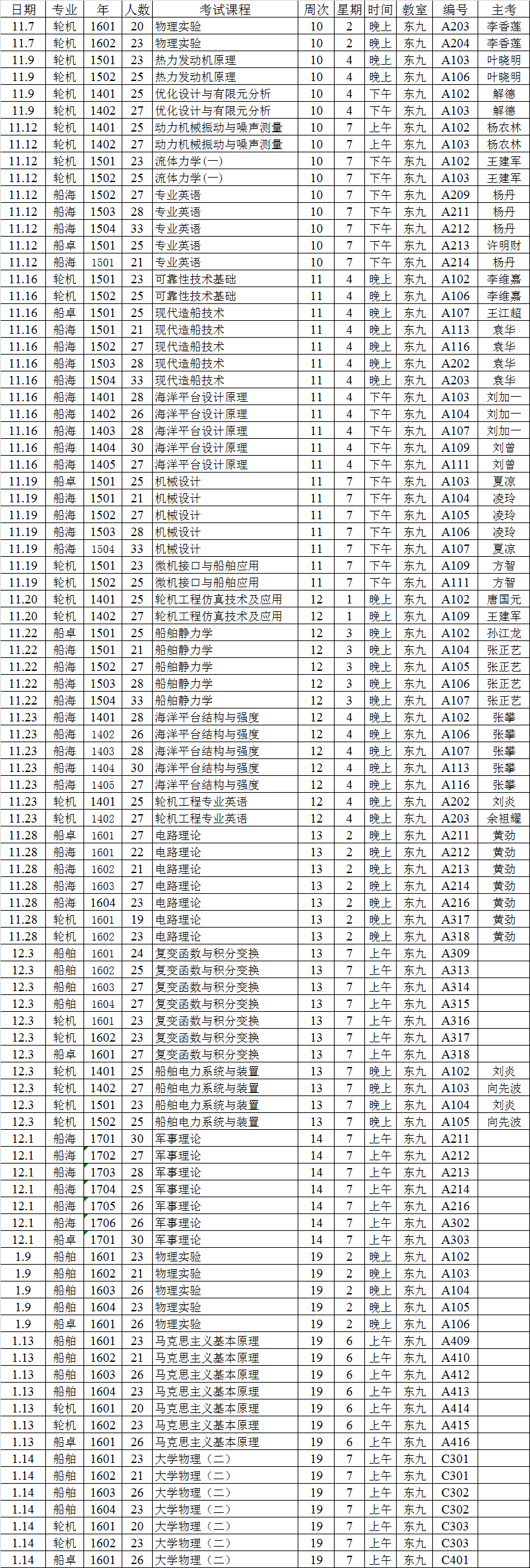 船海学院2017~2018学年第一学期考试安排