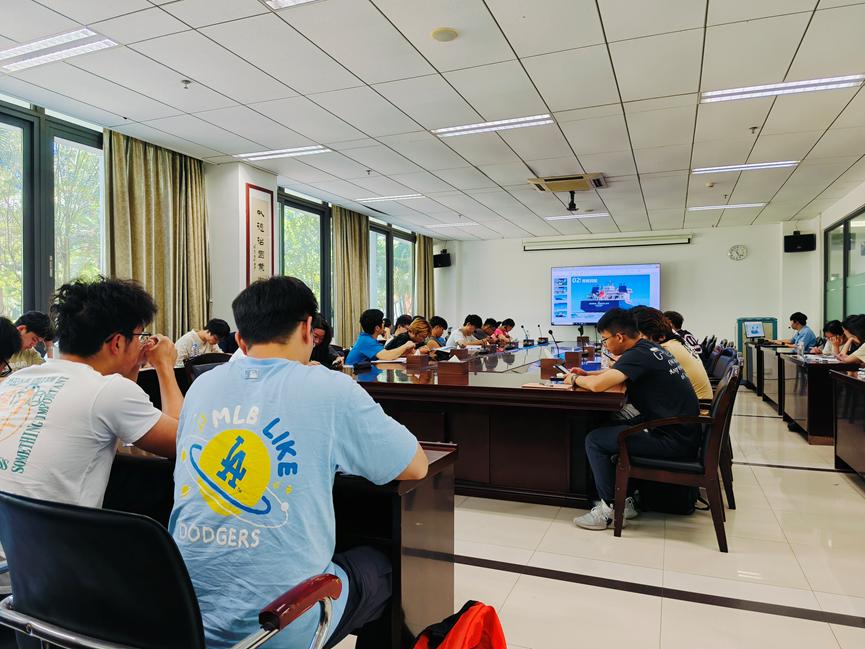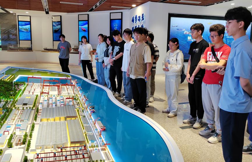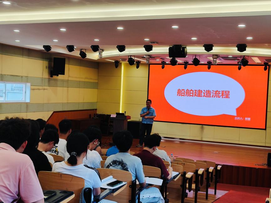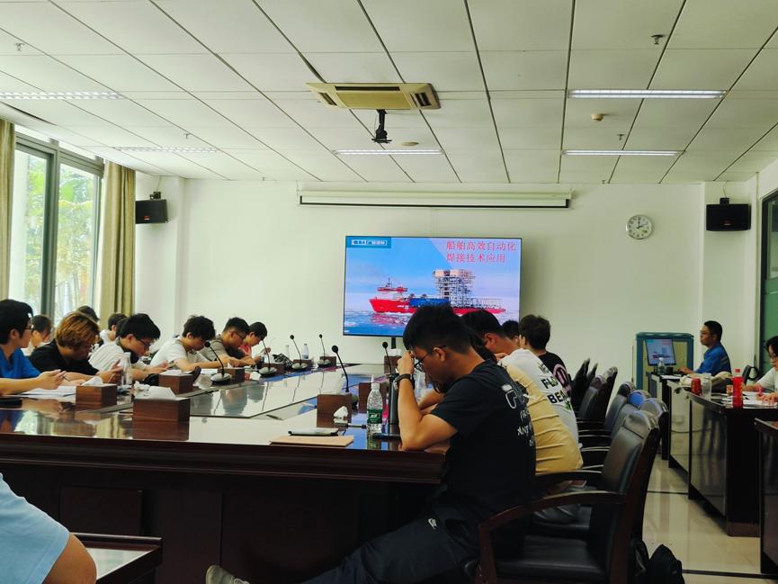 在广船国际有限公司南沙厂区,同学们在带领下有序分批参观了公司的展厅,对公司的发展历史、广船人不懈奋斗精神有了深入认识。随后,同学们结合建造现场先后完成了产品设计流程、生产建造流程、典型船舶介绍、激光复合焊工艺、造船质量管理等课程学习。最后,同学们与校友进行了深入交流。船舶工程专业1988届校友、正高级工程师聂众为同学们讲述了船舶生产建造流程,并寄语同学们学好专业知识,扎根船舶与海洋事业;轮机工程专业2017届校友、技术中心某室副主任李浩东为同学们介绍了广船国际建造的各型号典型船舶特点,并和同学们分享了工作经历,激励同学们心系国家事、肩扛国家责。