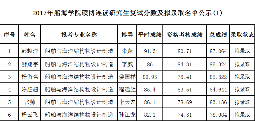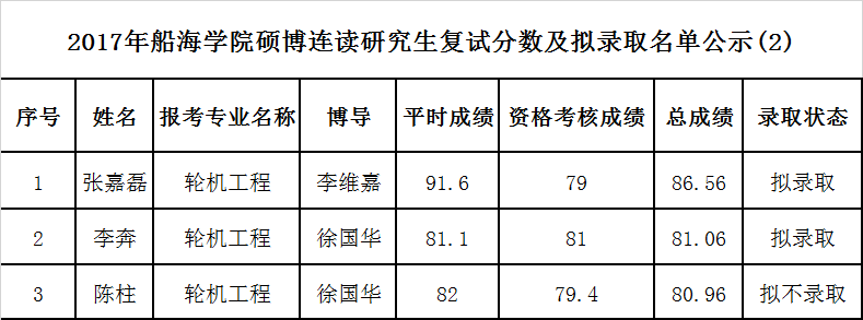 2017年船海学院硕博连读生复试分数线及拟录取名单公示