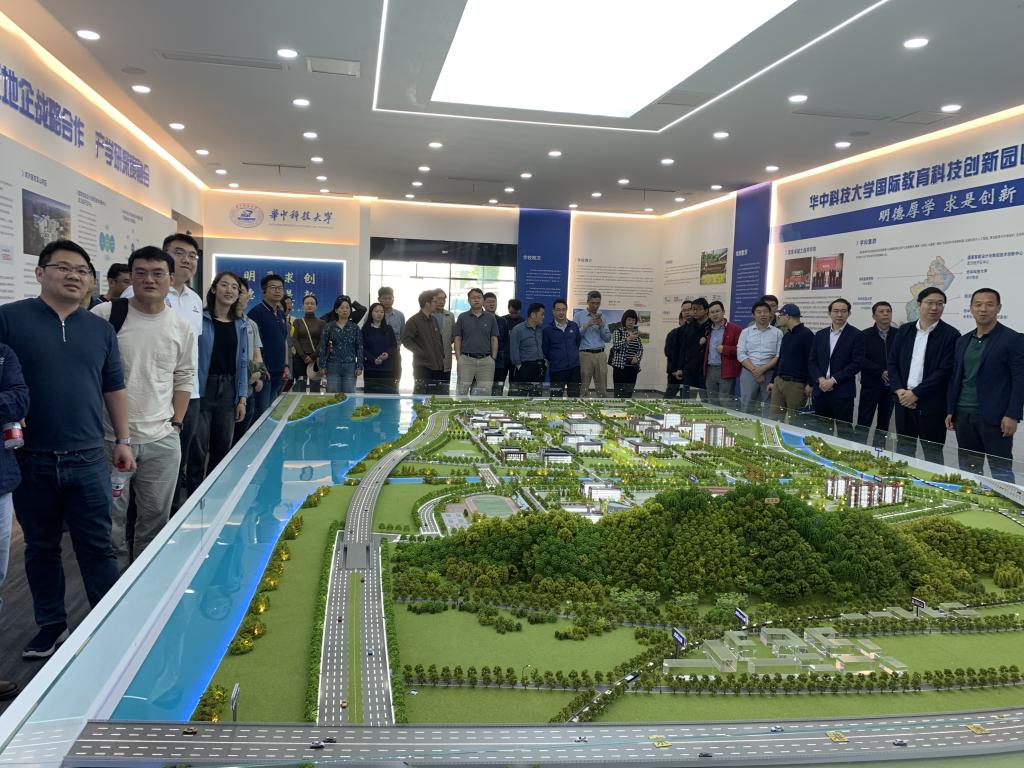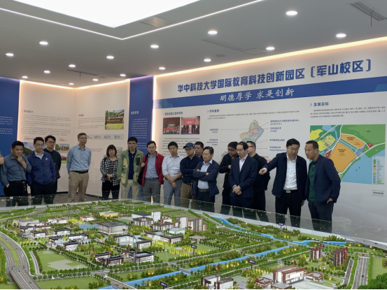 首先,老师们参观了华中科技大学军山校区城市展厅,军山校区陈扬主任和李义纯副主任作介绍。华中科技大学国际教育科技创新园区(军山校区)选址位于武汉经开区大军山脚下,东临长江,西靠汉南大道,南接兴七路,校园总用地2050亩,配套设施(中小幼、教师住宅)用地460亩。新园区整体规划学生规模2万人,首期规划学生规模1万人,教职员工规模约2000人,博士后规模约1000人,首期规划建筑面积约60万平方米。