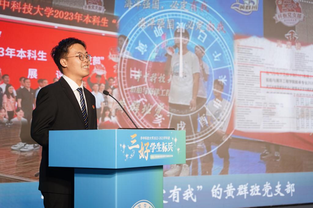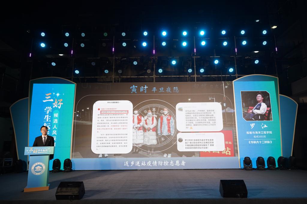 2023年11月3日晚,船海学院2020级本科生罗江站上了我校2022-2023年度“‘三好学生标兵’候选人风采展示暨优秀学子故事分享会”的舞台,在现场自信从容地分享着他的华科大十二时辰和对生命的思考,赢得了现场评委与观众的一致认可,最终获评本年度“校三好学生标兵”的称号。