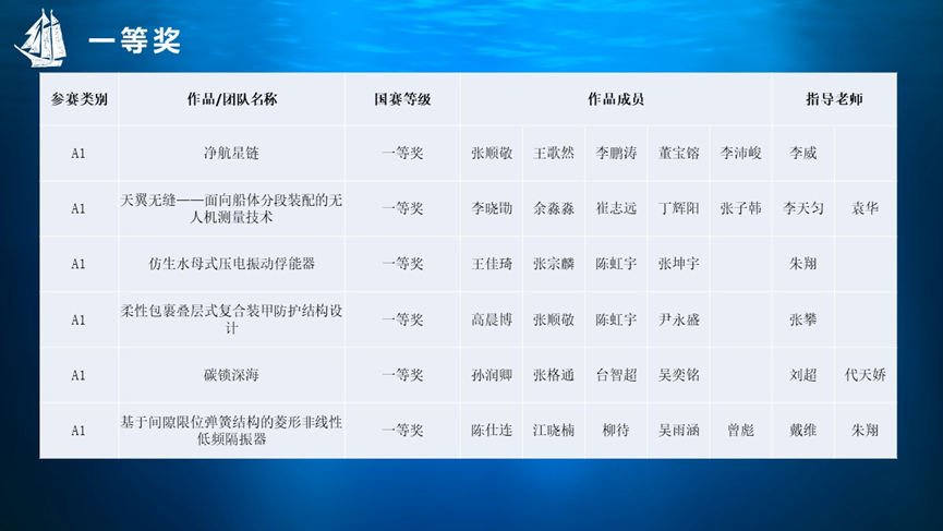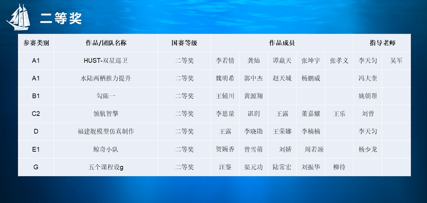 在海洋航行器设计与制作大赛赛道,以船海学院学生为主体的华中科技大学代表队获特等奖6项、一等奖12项、二等奖7项,创造历史最佳成绩。